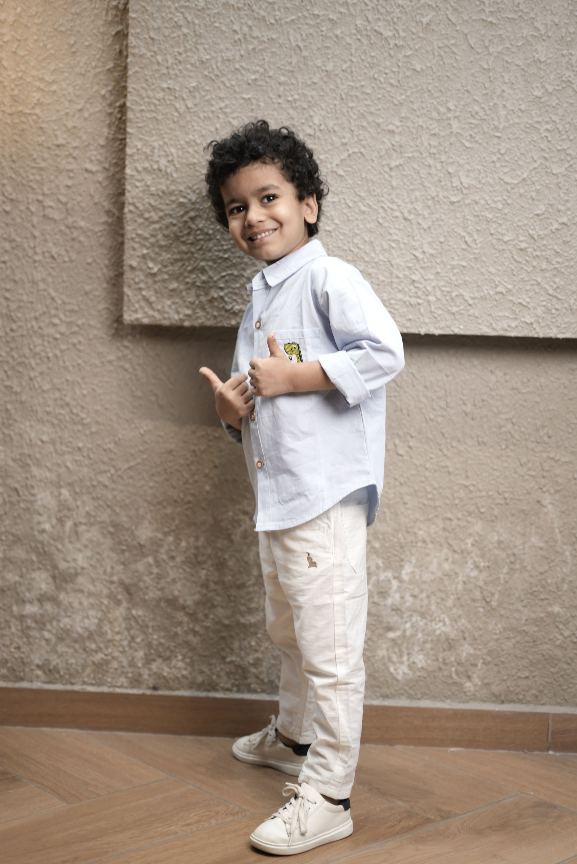 This classic cotton shirt offers a soft, breathable feel, perfect for all-day comfort. Designed with a timeless button-down front and a neat collar, it features a playful dinosaur patch on the chest pocket for a touch of whimsy. Ideal for casual outings or playdates, this shirt combines style with durability. Its versatile design pairs effortlessly with a variety of bottoms, making it a staple piece for any little explorer’s wardrobe.